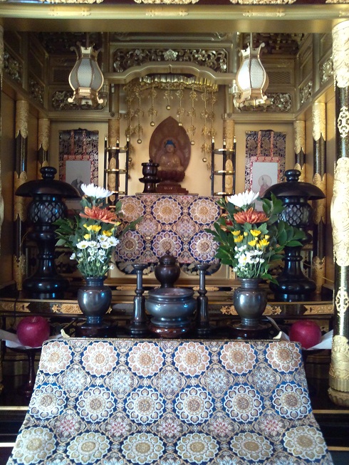 お盆やお彼岸、法要の際は打敷を掛けます。(撮影時が冬だったので、写真は冬用の打敷になっていますが、お盆は夏用の打敷を掛けます🙇♀️💦)