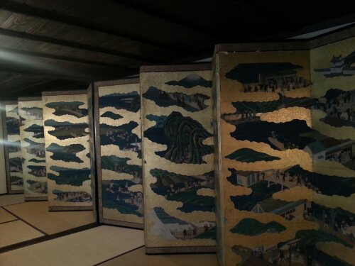 東海道五十三次の金屏風。六曲一双型が二隻の全十二扇からなる絵巻です。手前上の日本橋より一番奥の三条大橋まで五十五宿が細かく描かれており 各宿の特徴もよくわかります。作者は不明。しかし歌川広重の版画と被る構図があり 同時期の作品であると推測されます。二枚目の写真 関宿の絵も 広重の本陣朝立ちをモチーフにした様です。今のように気軽に旅に出ることの出来ない時代? 家にいながら旅の気分を味わう事ができ? また 関宿を訪れる旅人との 暖かな会話のきっかけにもなった事でしょう。全長約8メートル。深川屋二階展示室。要予約。