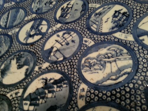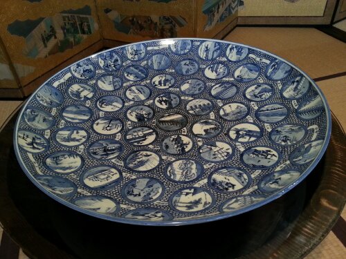 東海道五十三次宿場町を染付けた大皿。高10.0 径65.3 底径40.1。火に入れ1割強縮んだとするなら 染付けの段階では直径70センチ近かった伊万里焼です。各宿のデザインは やはり広重の版画をモチーフにした様な共通点がいくつかあり 江戸時代末の作品です。このお皿で河豚でも食べたいといつも思うのですが 誰がお皿を洗うのかを考えると 怖くて使うことができません。
