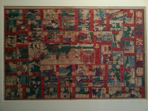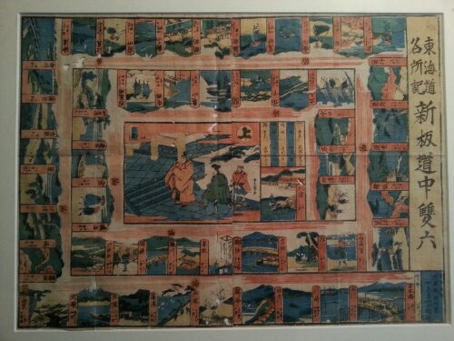 鎌倉時代より盛んに遊ばれていた双六は主に盤双六と言われ 和製バックギャモンの様な形をしていました。子どもたちの遊びではなく賭博の道具であり イメージが異なります。江戸時代元禄の頃 絵双六が登場し 歌舞伎や景色をモチーフにした色彩豊かなゲームとして広く遊ばれる様になったのです。一枚目の写真は江戸時代の絵双六です。道中双六 東海道五十三次の旅を二つのサイコロを使って遊びました。同じ東海道を描いた明治時代の双六が下の写真。文明開化双六です。二つの双六には大きな違いがあります。それは江戸時代の上がりは京都? 明治の上がりは東京に変わっている事。更に江戸時代の双六には朱色と呼ばれる赤が使われ 明治の赤は真っ赤になっているのも特徴です。文明開化と同時に時代がキナ臭い流れになって行く そんな背景も伺わせる赤なのです。