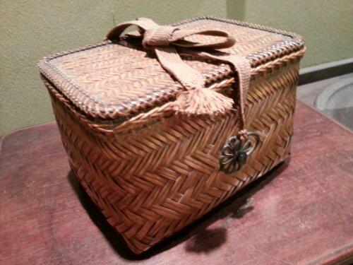 銘菓 関の戸はお抹茶のお手茶菓子として今から約370年前にこの世に生まれました。鈴鹿の峰に降り積もる白雪になぞらえたと伝わるお伴で 御所や諸大名の冬季のお茶席に広く使われたお菓子です。お茶席に出向く折り 茶碗や茶筅 お抹茶を入れる棗等を入れた籠が茶籠です。深川屋にある茶籠は 編み方も複雑で 蓋の裏には螺鈿細工の花があしらわれ 素朴な外見からは想像もつかない雅な籠です。お茶席で蓋を開けた時の感動をも おもてなしをする一服のお茶への演出なのでしょう。