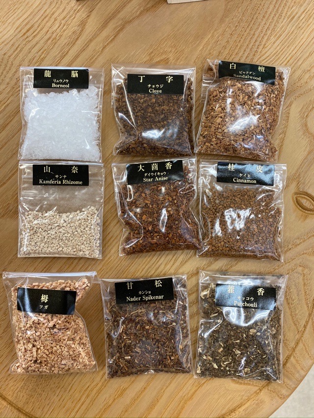 白檀・桂皮・藿香・丁字・大茴香・甘松・龍脳・山奈・栂