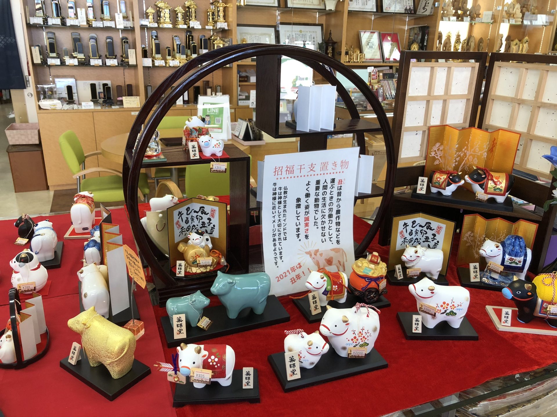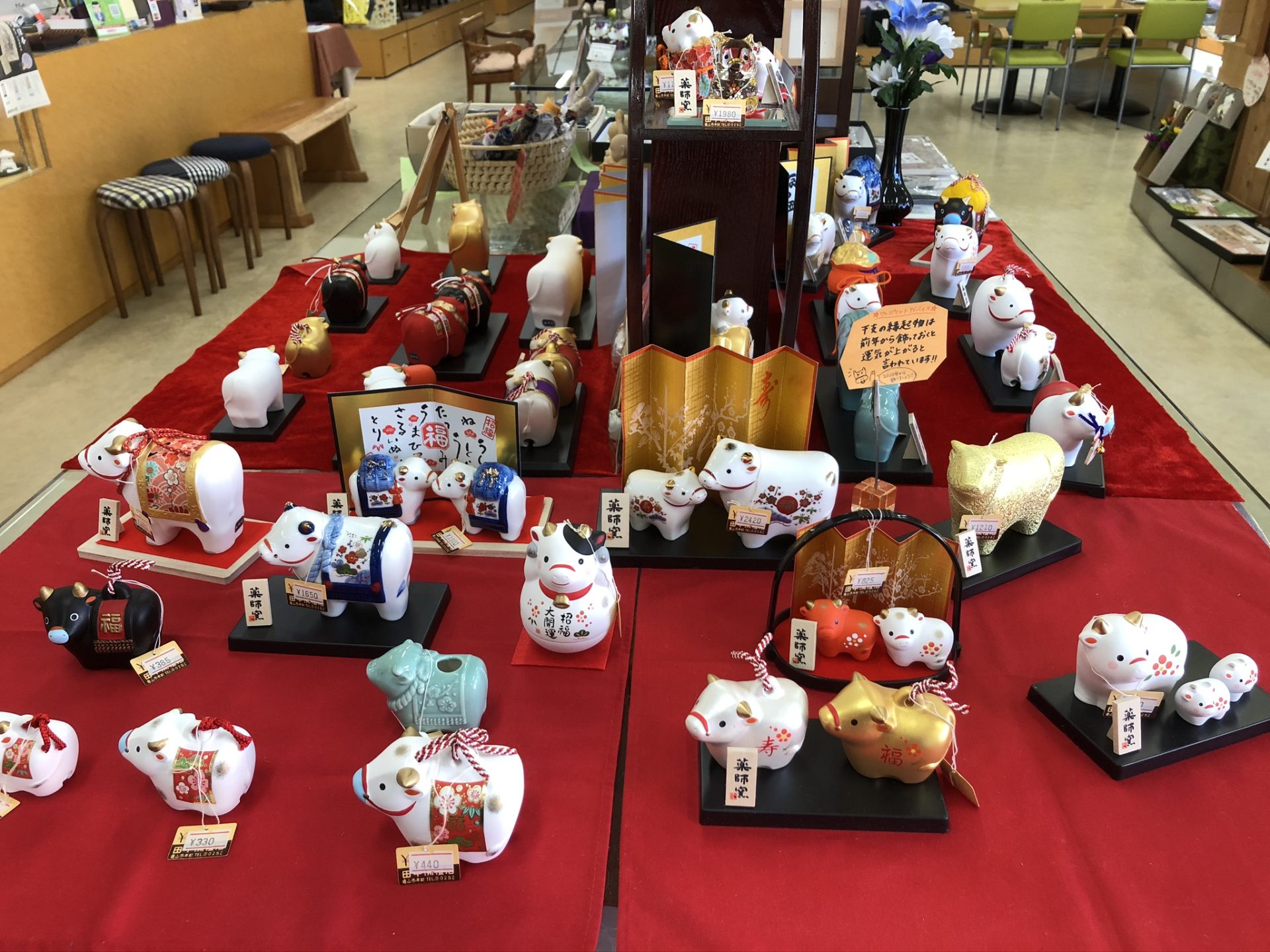 赤い丑(赤べこ)の置物もいくつか並んでいます🐂