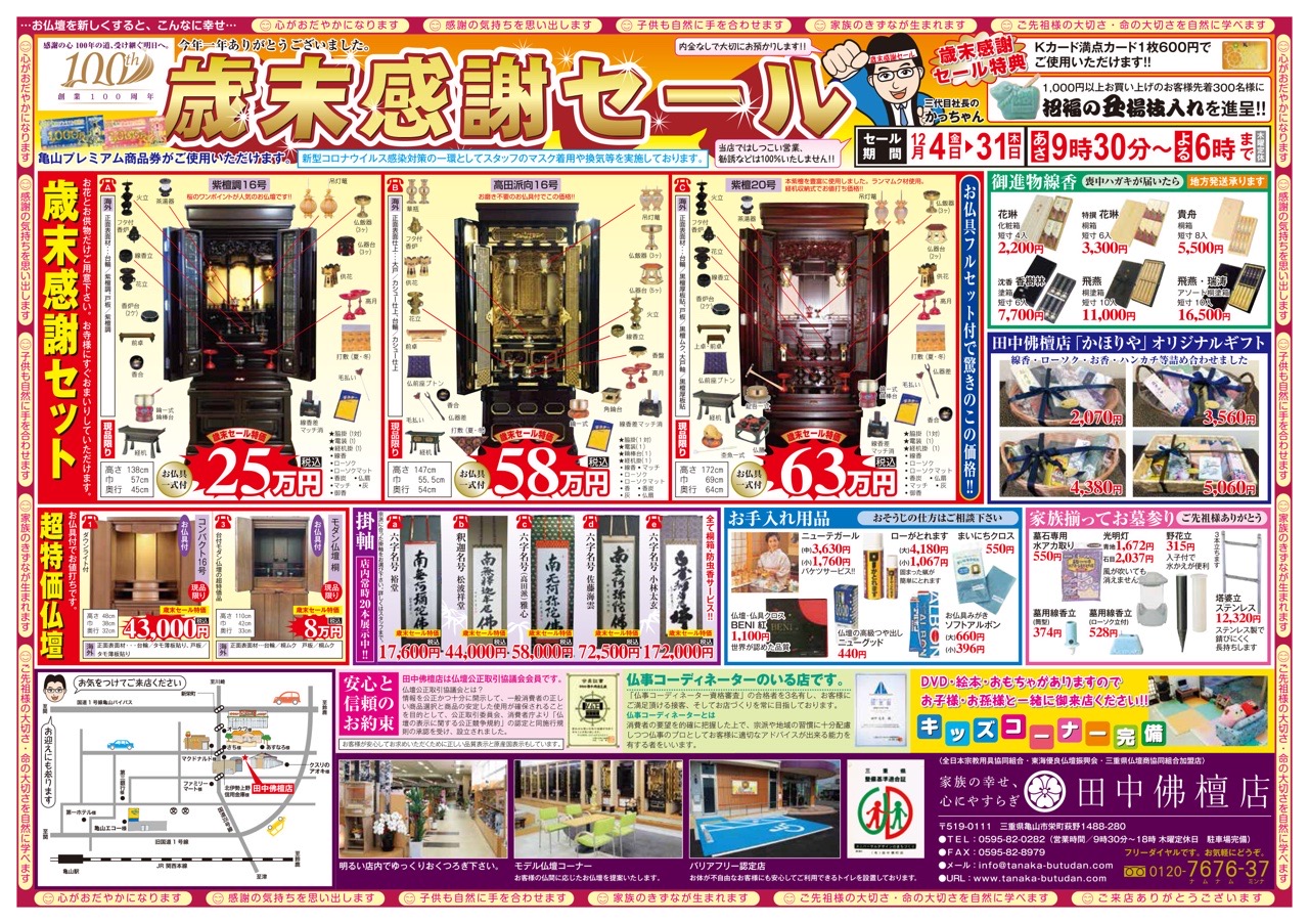 今年1年の感謝を込めまして、伝統的な金仏壇・木の温もりを感じる唐木仏壇・洋間にピッタリなデザインのモダン仏壇を、お仏具付きの歳末セール特価でご奉仕致します!!