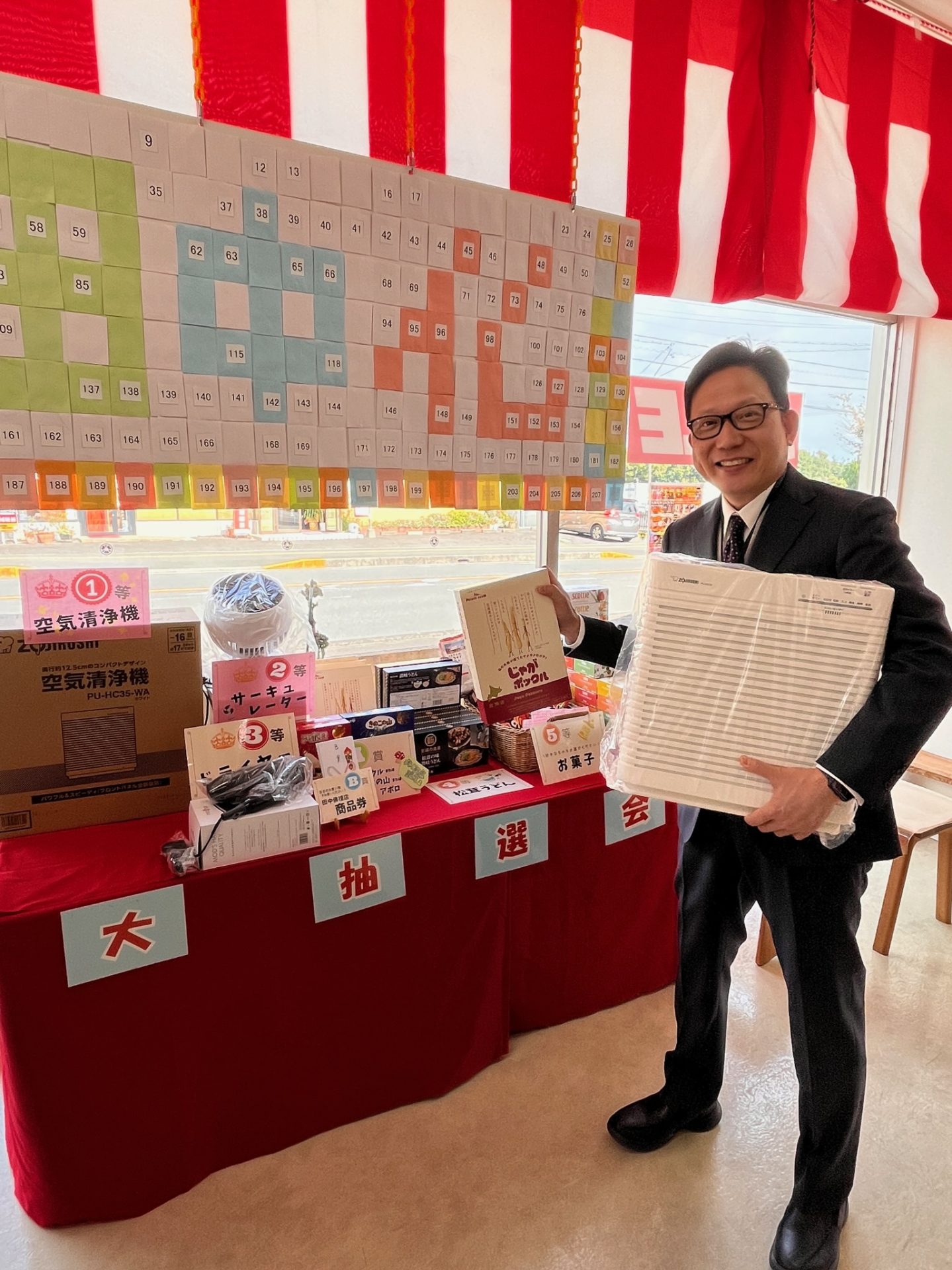 上の写真で当店店主が手に持っている一等の空気清浄機は、28日朝の時点でまだ出ていません❗️