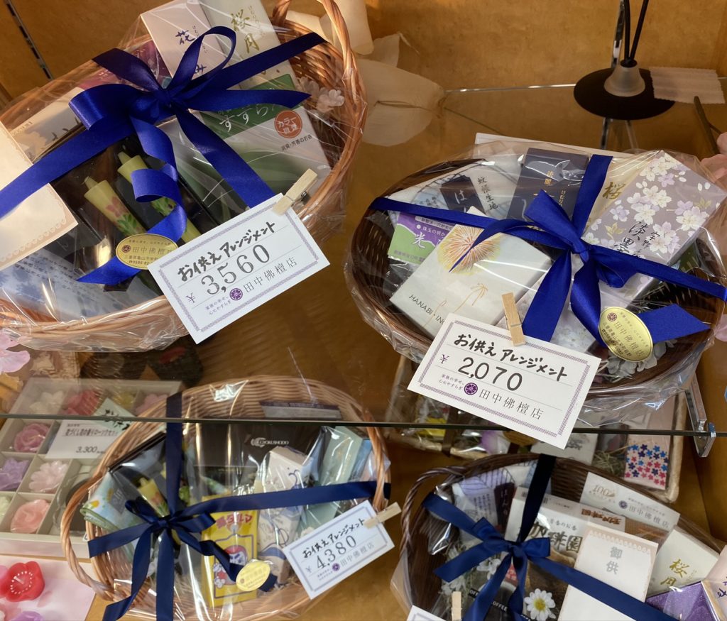 お線香やローソクなどを詰め合わせた田中佛檀店オリジナルのお供えアレンジメントです。