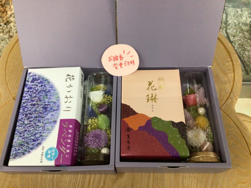 お相手のことを想って、綺麗なお花とともにお花の香りのお線香を選べるのが素敵ですよね☺️(お花の香りですと写真のラベンダー、他にもすずらん、ローズなども🌹)