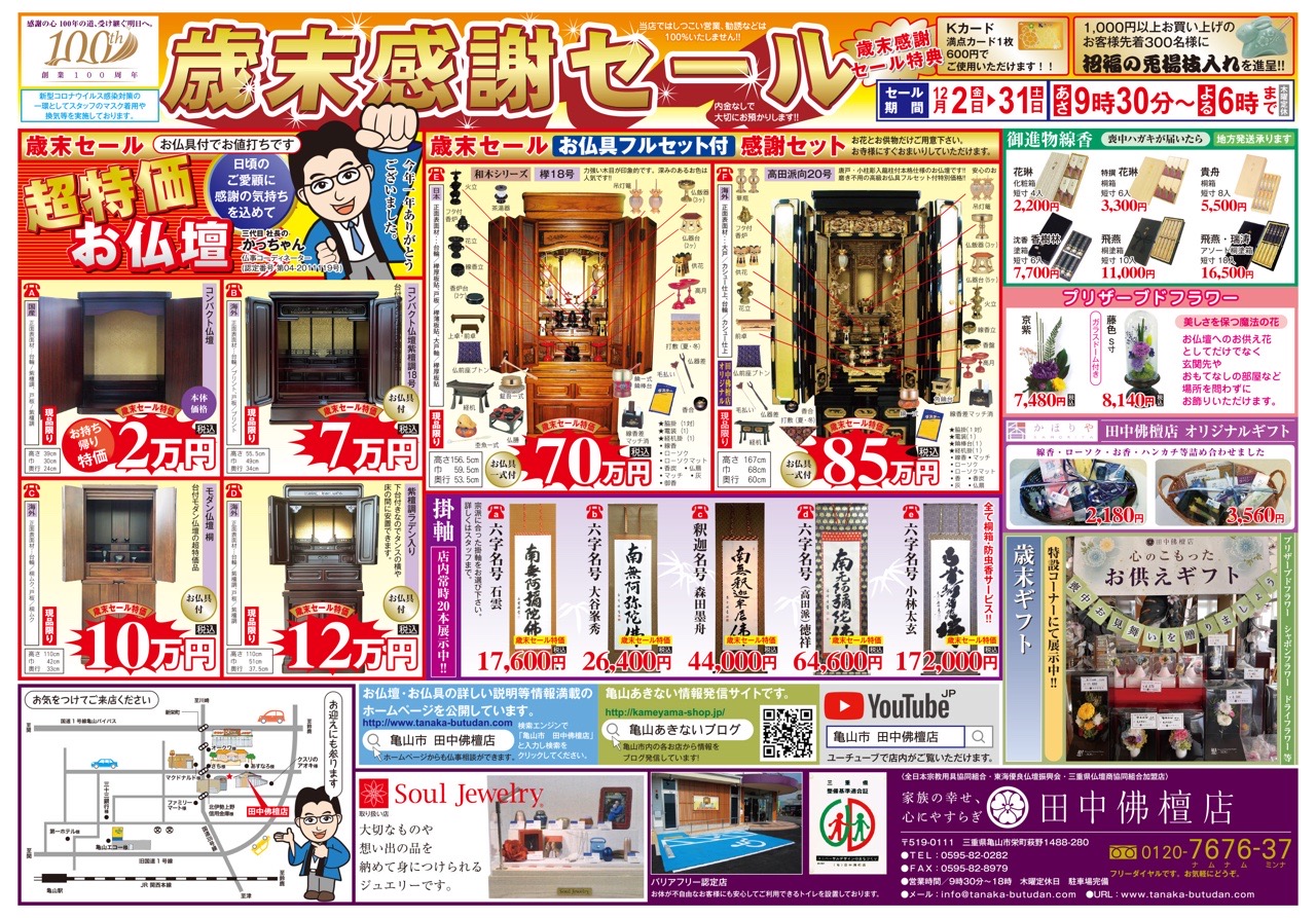 田中佛檀店では、12月2日(金)から大晦日まで「歳末感謝セール」を開催いたします✊