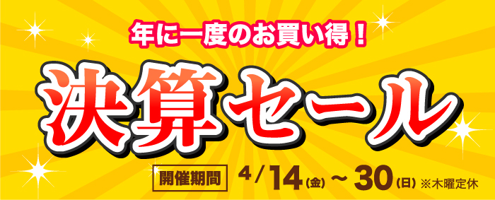 当店では、4月14日(金)〜30日(日)まで「決算セール2023」を開催いたします✊