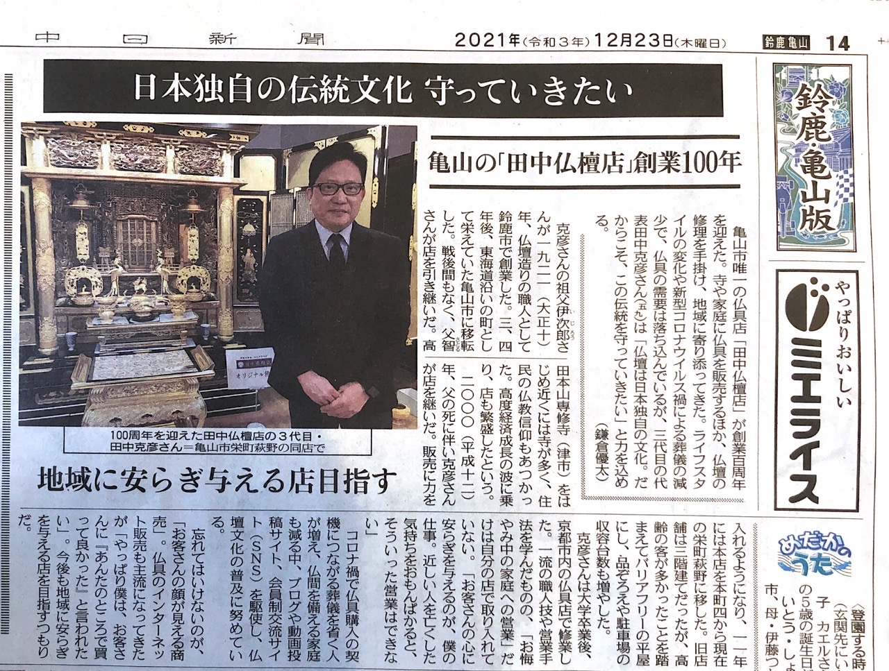 本日12月23日の、中日新聞 朝刊 鈴鹿亀山版に当店を掲載して頂いております😊📰