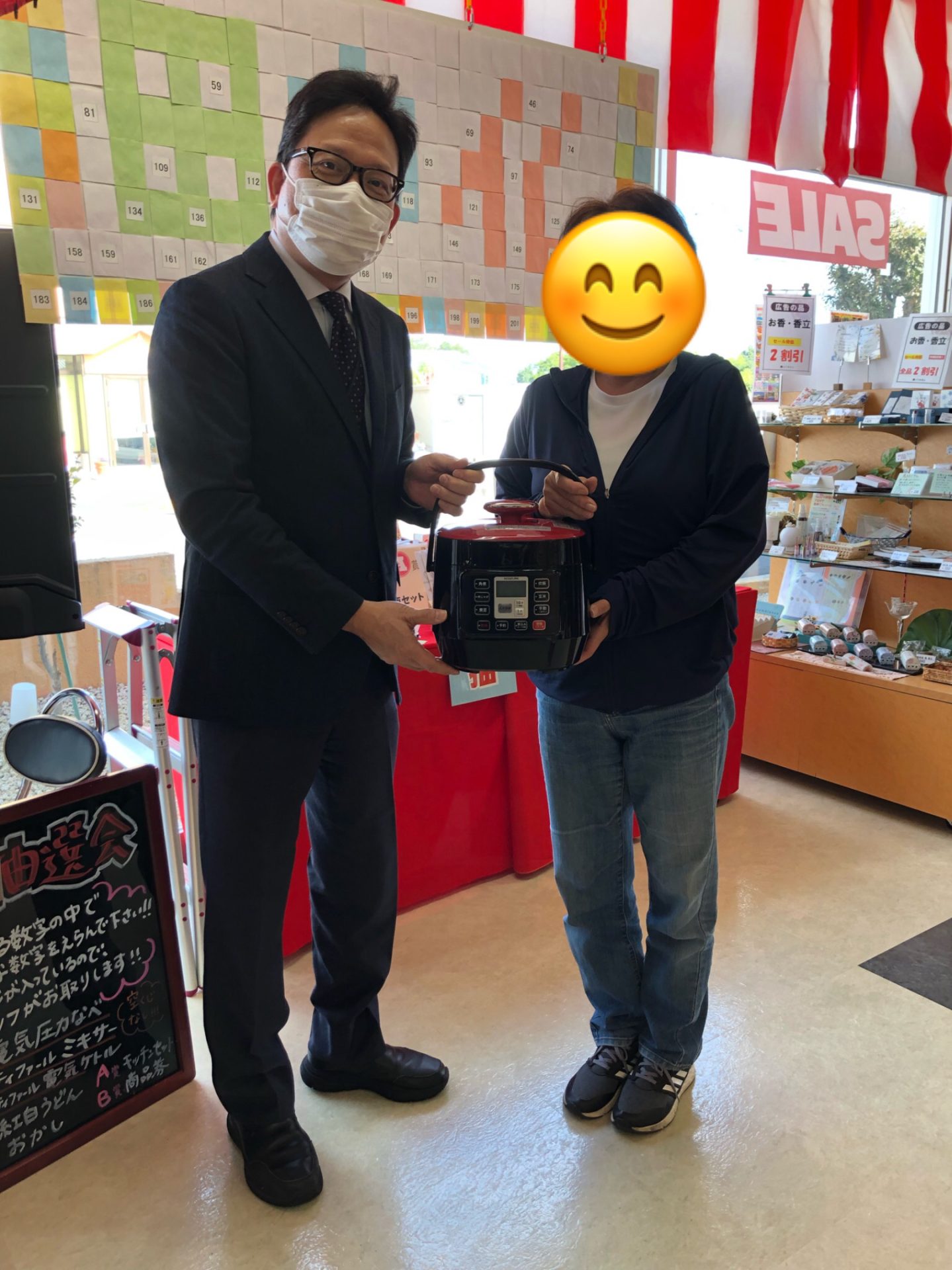 大抽選会で1等の電気圧力鍋を見事に当てられたお客様と、当店社長の1枚です✨