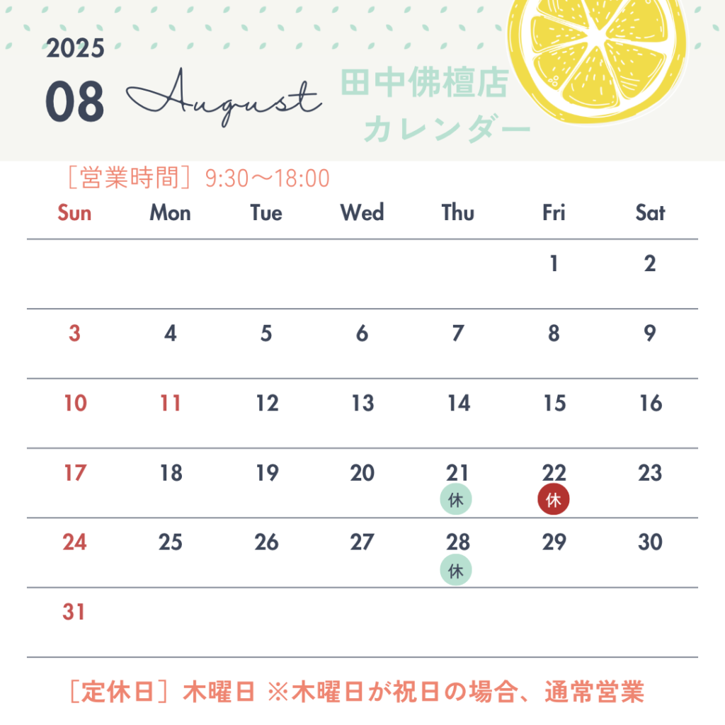田中佛檀店、8月のお休みカレンダーです🏖️🗓️